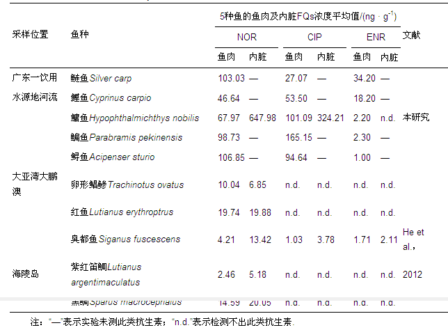 本研究測得5種魚的魚肉中的FQs含量均顯著高于大亞灣大鵬澳和海陵島中魚的FQs的含量;部分魚類魚肉和內(nèi)臟中NOR、CIP含量高于美國、歐盟的許多國家的殘留標(biāo)準(zhǔn)(殘留限量為30 ng · g-1),也高于我國農(nóng)業(yè)部標(biāo)準(zhǔn)NY 5070—2001《無公害食品水產(chǎn)品中漁藥殘留限量》的殘留標(biāo)準(zhǔn)(NOR、CIP殘留限量為50 ng · g-1).分析原因乃為同上,主要是養(yǎng)殖魚塘、禽畜養(yǎng)殖業(yè)、城鎮(zhèn)生活污水及感潮河流的滯留效應(yīng),導(dǎo)致面源污染嚴(yán)重,水體中可能含有較高的FQs含量.Li的研究表明FQs在可食用的軟體動物內(nèi)臟中性質(zhì)穩(wěn)定(Li et al., 2012);孫言春的研究也表明FQs在魚體內(nèi)吸收較快,消除較慢,F(xiàn)Qs在魚體內(nèi)富集作用較強(qiáng).魚內(nèi)臟部位為代謝器官,因此,更易積累,造成魚內(nèi)臟中抗生素含量較高的現(xiàn)象.魚體內(nèi)臟中FQs含量多數(shù)情況下高于魚肉中FQs含量,這個結(jié)果與He的研究結(jié)果一致.