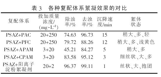 由表2 可知:6 種絮凝劑中,PAC?PFC?APAM?CPAM 對(duì)廢水中油的去除效果較差, 而PSAZ 和陽(yáng)離子淀粉絮凝劑對(duì)油的去除效果相對(duì)較好?其原因是PSAZ 除了具有單元無機(jī)高分子絮凝劑的共同優(yōu)點(diǎn)外,其異核金屬離子的交錯(cuò)排列能夠形成更長(zhǎng)?更穩(wěn)定的分子鏈,一方面增加了其聚合度和分枝程度,使網(wǎng)捕作用加強(qiáng); 另一方面金屬離子的引入增加了所帶的電荷量,使其吸附電中和能力提高,增加了其處理效果?陽(yáng)離子淀粉絮凝劑的處理效果雖然次于PSAZ,但其沉淀速度是最快的,這就縮短了處理時(shí)間,提高了處理效率?各種復(fù)配體系絮凝效果的對(duì)比如表3 所示?