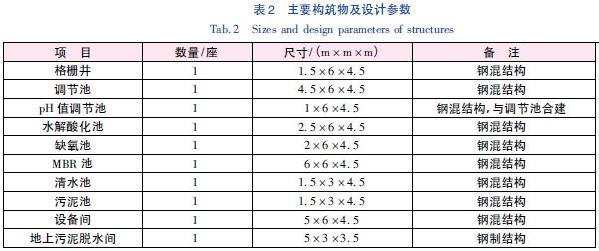 廢水先通過機械格柵除去較大的固體懸浮物。從格柵井流出廢水泵入調節(jié)池,以均勻水質,緩解水力沖擊負荷對后續(xù)工藝的影響。調節(jié)池出水進入水解酸化池,水解酸化池出水依次進入缺氧池和MBR 池,缺氧池的主要作用是進行反硝化脫氮,從而去除廢水中的氨氮。MBR 集膜的高效分離和生物降解于一體,是將污水生物處理技術與膜分離技術相結合的新型污水處理工藝。其用膜組件代替了傳統(tǒng)活性污泥工藝中的二沉池,可進行高效固液分離,達到水凈化的目的,克服了傳統(tǒng)工藝中出水水質欠穩(wěn)定、污泥易膨脹等不足。生物反應器內保持較高的污泥濃度,硝化能力強,污染物去除率高,部分混合液回流至缺氧池進行反硝化去除氨氮。MBR 池出水進入到清水池進行消毒后,出水可回用或達標排放。主要構筑物尺寸及設計參數見表2。