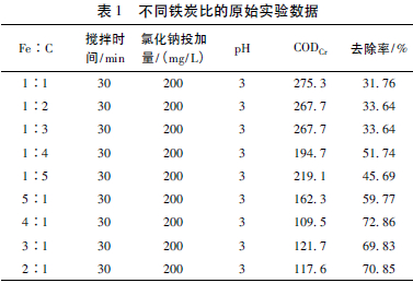 控制其他反應(yīng)條件不變,氯化鈉投加量為200 mg/L,pH值為3,攪拌時間為30 min,將鐵的投加量固定為20 g/L,在不同的鐵炭比(Fe∶C=5∶1、4∶1、3∶1、2∶1、1∶1、1∶2、1∶3、1∶4、1∶5) 條件下進行反應(yīng)。測定各水樣CODCr值,計算CODCr的去除率,結(jié)果見表1。