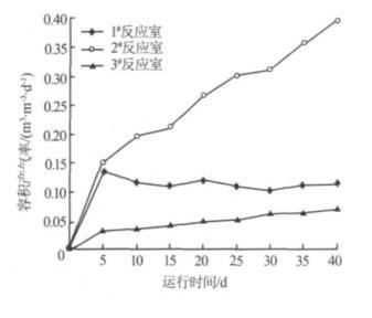 由圖 6 可見,2# 反應(yīng)室產(chǎn)生的 CH4 最多,容積產(chǎn)氣率 >0.153 m3/(m3· d),最高達(dá) 0.397 m3/(m3· d),并隨著容積負(fù)荷的 增加而增大 ( 隨運(yùn)行時(shí)間延長(zhǎng)容積負(fù)荷增加 ),表明 2# 反應(yīng)室以產(chǎn)甲烷菌為主。 1# 反應(yīng)室產(chǎn)生的 CH4 量受進(jìn)水容積負(fù) 荷的影響不大 ,總體保持在 0.103~ 0.137 m3/(m3· d) 的水平 ,表明 1# 反應(yīng)室主要起水解和酸化作用 ,以產(chǎn)酸菌為主,產(chǎn)甲烷菌的活性受到抑制 ,而且受進(jìn)水容積負(fù)荷的直接沖擊,CH4 產(chǎn)量呈現(xiàn)小幅度的波動(dòng) 。 3# 反應(yīng)室與 2# 反應(yīng)室一樣 ,產(chǎn) CH4 量隨著容積負(fù)荷的增加而增大 ,但 產(chǎn) CH4 量 始 終 很 低 ,其 容 積 產(chǎn) 氣 率 最 大 為 0.071 m3/(m3· d),表明 3# 反應(yīng)室也以產(chǎn)甲烷菌為主 ,但由于廢水流至 3# 反應(yīng)室時(shí)剩余的有機(jī)物很少 ,底物不足,因此 CH4 量很少 。