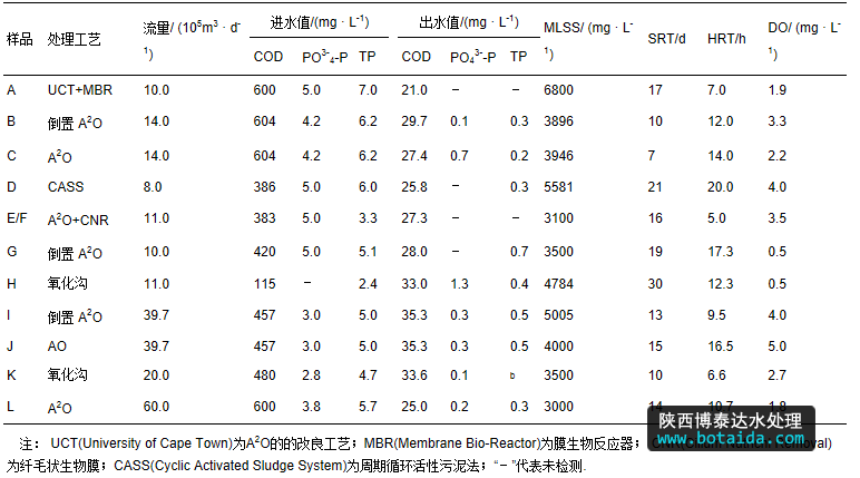 實驗所用的污泥樣品分別采集于9個污水處理廠,其中有2個水廠各包含2個工藝,共11個工藝.每個工藝取1個污泥樣品.其中,針對A2O+纖毛狀生物膜(CNR)工藝取2個樣品,分別位于加膜區(qū)和無膜區(qū),是為了考察加膜對聚磷菌的菌群結(jié)構(gòu)是否有影響,因此,共有12個樣品.12個樣品依次命名為A、B、C、D、E、F、G、H、I、J、K和L.其中,B和C取自同一水廠,I和J取自同一水廠,E和F取自A2O+纖毛狀生物膜工藝的加膜區(qū)和無膜區(qū).污水處理廠的運行參數(shù)及進出水指標見表 1.