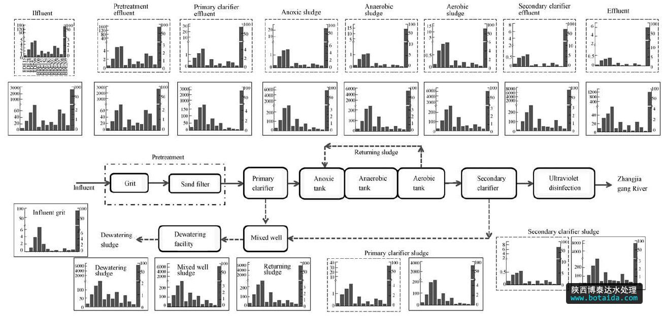 2012年4月份則采集了該廠各個(gè)構(gòu)筑物的出水和污泥樣品,采樣點(diǎn)和類型見(jiàn)圖 1.我們?cè)?4: 00—17: 00之間,每個(gè)小時(shí)分別采集該構(gòu)筑物的污水和污泥樣品,然后分別將污水和污泥樣品混合在一起作為一個(gè)混合樣.污水和污泥樣品是分別用干凈的棕色玻璃瓶和廣口瓶采集的,每個(gè)采集瓶上方不留空間,采集完之后立馬放入冰袋中,并運(yùn)到實(shí)驗(yàn)室保存.