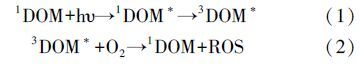 溶解性有機(jī)質(zhì)(DOM)含有發(fā)色基團(tuán),是重要的天然光敏劑,在紫外輻射或太陽光照射下,單線態(tài)(state DOM singlet,1DOM)分子吸收光能先轉(zhuǎn)化為激發(fā)單線態(tài)(excited state DOM singlet,1DOM*),進(jìn)而轉(zhuǎn)化為激發(fā)三線態(tài)(excited state DOM triplets,3DOM*),進(jìn)一步與溶解氧分子發(fā)生一系列反應(yīng),產(chǎn)生活性氧物質(zhì)(reactive oxygen species,ROS),如羥基自由基(hydroxyl radical,· OH)、單線態(tài)氧(singlet oxygen,1O2)、超氧化物(superoxide,O2-)等(見反應(yīng)式(1)、(2.這些活性氧物質(zhì)可以誘導(dǎo)有機(jī)污染物光降解,同時,DOM也會與目標(biāo)化合物競爭光吸收,或猝滅目標(biāo)化合物的激發(fā)態(tài),DOM對有機(jī)污染物的光解具有光敏化和光屏蔽雙重作用(Chen et al., 2009;,這與DOM的來源、組成、化學(xué)結(jié)構(gòu)等特點(diǎn)密切相關(guān).因此,溶解性有機(jī)質(zhì)在水生生態(tài)系統(tǒng)光化學(xué)中扮演重要角色,可以影響有機(jī)污染物的環(huán)境行為和生態(tài)風(fēng)險.