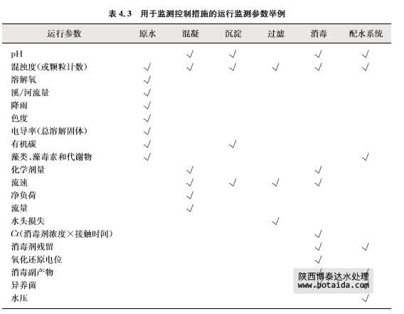 運(yùn)行監(jiān)測包括參數(shù)測量或者觀測活動。所選定的運(yùn)行監(jiān)測參數(shù)應(yīng)能反映每步控制措施 的有效性,能及時指示運(yùn)行情況,并能很快地被測量,能及時采取適當(dāng)?shù)膽?yīng)對措施。像一些 可測量的變量,如余氯、 pH和渾濁度,或可觀察到的因子,諸如防蟲網(wǎng)的完整性。 腸道病原體和指示生物在運(yùn)行監(jiān)測中應(yīng)用有限,因?yàn)樘幚砗头治鏊畼铀钑r間太長,來 不及在供水之前對操作做出調(diào)整。