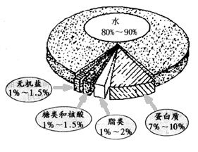 水在細(xì)胞中含量是最多的.在不同種類的生物體中,水的含量差別較大,一般來(lái)說(shuō),生物體中水的含量為60%~95%.例如,幼嫩植物體中水的含量約為70%,動(dòng)物體中水的含量約為80%左右,水母的身體里水的含量竟約為97%.