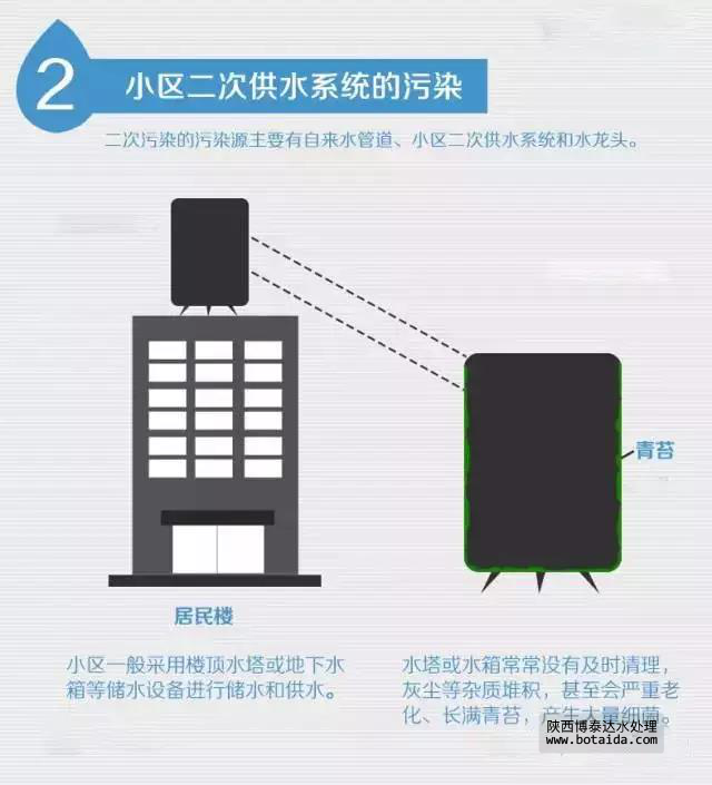 小區(qū)一般采用樓頂水塔或地下水箱等儲水設(shè)備進行儲水和供水。而水塔或水箱常常沒有及時清理,灰塵等雜質(zhì)堆積。有的儲水設(shè)備甚至?xí)乐乩匣?、長滿青苔,產(chǎn)生大量細菌滋生。