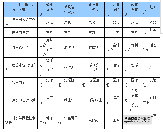 旋轉式潷水器由集水槽、排水管、回轉支座、連桿裝置、導軌及傳動裝置等組成。