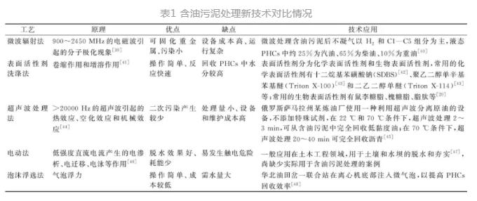 其他技術(shù)主要包括微波輻射法、表面活性劑洗滌法、超聲波處理法、電動(dòng)法、泡沫浮選法等,尚處于實(shí)驗(yàn)室研究階段,具體對(duì)比情況見(jiàn)表1。