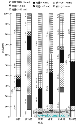 另外,不同尺寸級(jí)別的塑料垃圾數(shù)量比例也存在差異(圖 1).除南山灣和北山灣以外,其余4個(gè)沙灘中微型塑料總數(shù)所占比例都較高(高于70%),北山灣和南山灣的塑料垃圾中占比最大的尺寸主要集中在5~15 mm(占比均高于50%),且以泡沫為主.北山灣和中信北部沙灘上的中型塑料碎片(5~15 mm)比例較高,這些都可能成為該地區(qū)后期微型塑料污染的潛在來(lái)源.