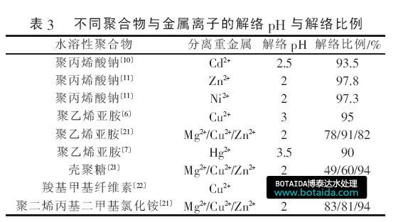 由表3 可知,使用酸化再生法時(shí),解絡(luò)pH 一般在2~3?在選定解絡(luò)pH 后,解絡(luò)的效果受聚合物與金屬離子影響?而同一金屬離子與不同聚合物在同一pH 條件下的解絡(luò)效果差異也較大〔21-22〕?
