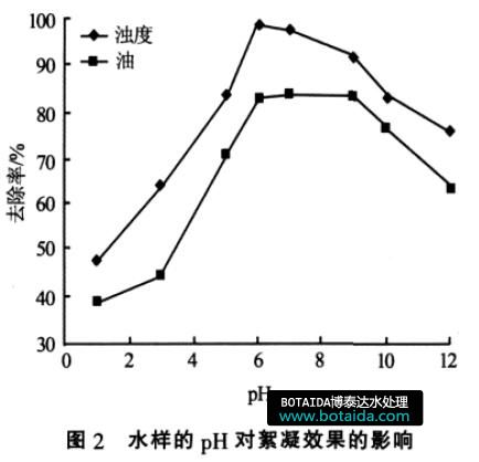 試驗采取方法2 的投加順序, 通過改變水樣的pH 來考察其對絮凝效果的影響,結(jié)果見圖2?