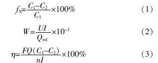 COD:Hach試劑法;氨氮:Hach試劑法;堿度:鹽酸滴定法;硬度:EDTA滴定法;氯離子:硝酸銀滴定法;電導(dǎo)率:電導(dǎo)率儀測(cè)量;濁度:濁度計(jì)測(cè)量;pH:pH計(jì)測(cè)量;另外需要記錄的裝置運(yùn)行參數(shù)包括流量、壓強(qiáng)、運(yùn)行電壓、電流等。脫鹽率、耗電量、電流效率分別按照式(1)~式(3)計(jì)算。