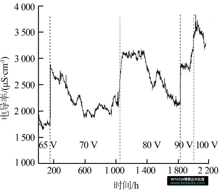 運(yùn)行電壓隨進(jìn)水電導(dǎo)率變化趨勢(shì)見圖3。