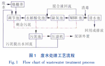 廢水先通過機(jī)械格柵除去較大的固體懸浮物。從格柵井流出廢水泵入調(diào)節(jié)池,以均勻水質(zhì),緩解水力沖擊負(fù)荷對后續(xù)工藝的影響。調(diào)節(jié)池出水進(jìn)入水解酸化池,水解酸化池出水依次進(jìn)入缺氧池和MBR 池,缺氧池的主要作用是進(jìn)行反硝化脫氮,從而去除廢水中的氨氮。MBR 集膜的高效分離和生物降解于一體,是將污水生物處理技術(shù)與膜分離技術(shù)相結(jié)合的新型污水處理工藝。其用膜組件代替了傳統(tǒng)活性污泥工藝中的二沉池,可進(jìn)行高效固液分離,達(dá)到水凈化的目的,克服了傳統(tǒng)工藝中出水水質(zhì)欠穩(wěn)定、污泥易膨脹等不足。生物反應(yīng)器內(nèi)保持較高的污泥濃度,硝化能力強(qiáng),污染物去除率高,部分混合液回流至缺氧池進(jìn)行反硝化去除氨氮。MBR 池出水進(jìn)入到清水池進(jìn)行消毒后,出水可回用或達(dá)標(biāo)排放。主要構(gòu)筑物尺寸及設(shè)計參數(shù)見表2。