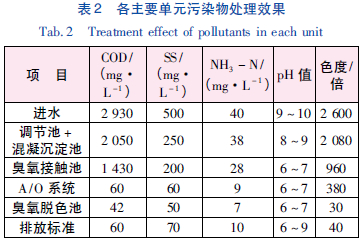 本工程經(jīng)過近2 個月的調(diào)試運行后,出水水質(zhì)穩(wěn)定,COD 總?cè)コ蕿?8.6%,達到設(shè)計要求。各單元的處理效果見表2。