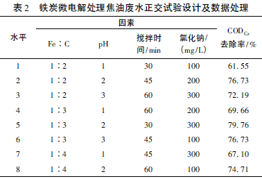 通過正交試驗,得到可以使CODCr去除率最高的最佳條件是: 鐵炭比為1∶3,pH值為2,氯化鈉投加量為200 mg/L,攪拌時間為45 min。在該條件下,焦油廢水的CODCr去除率最高,達(dá)到81. 26%。對于廢水的預(yù)處理來說,這樣的去除效果較為良好。