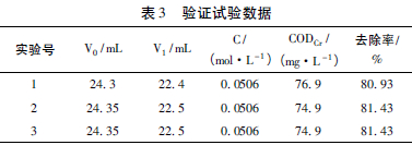 由正交試驗的數(shù)據(jù)分析已知: 本實驗的最佳條件為Fe∶C =1∶3,NaCl 的投加量為200 mg/L,pH為2,攪拌反應(yīng)時間為45 min。用該條件處理卷煙廠的焦油廢水,進(jìn)行三組平行實驗,測定這三個水樣的CODCr值,計算其去除率,從而驗證該條件是否最佳。實驗數(shù)據(jù)見表3。