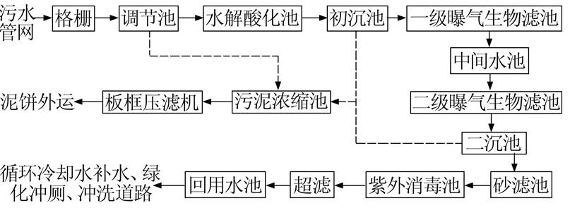 由于污水處理后主要供循環(huán)冷卻水系統(tǒng)補(bǔ)水,對水質(zhì)要求較高。水解酸化工藝可提高污水的可生化性。曝氣生物濾池(BAF)集生物氧化、截留懸浮固體為一體,具有抗沖擊負(fù)荷能力強(qiáng)、污泥產(chǎn)量較少、出水水質(zhì)穩(wěn)定等特點(diǎn)〔1, 2〕。超濾在過濾微細(xì)懸浮物及膠體物質(zhì)方面具有良好的效果〔3, 4〕,因此采用水解酸化—曝氣生物濾池—超濾組合工藝進(jìn)行處理,工藝流程如圖 1所示。從流程上分為3個(gè)部分: 預(yù)處理工藝、生化處理工藝和深度處理工藝。其中生化處理工藝為水解酸化—兩級曝氣生物濾池工藝,深度處理工藝為超濾工藝。