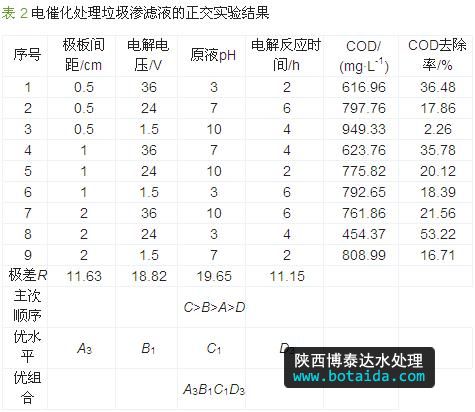 分析表 2發(fā)現(xiàn),原液pH對(duì)降解效果的影響最顯著,其次是電解電壓;各因素對(duì)電催化反應(yīng)的影響順序?yàn)椋涸簆H>電解電壓>極板間距>電催化氧化時(shí)間。