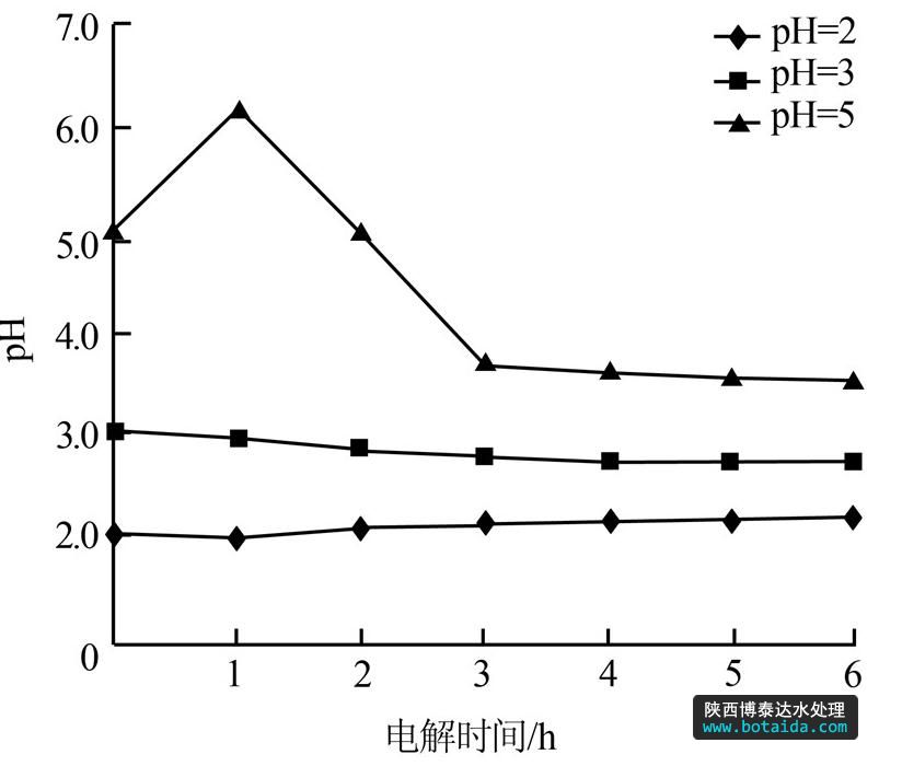 圖 3 初始pH為2、3、5時(shí)pH隨時(shí)間變化情況