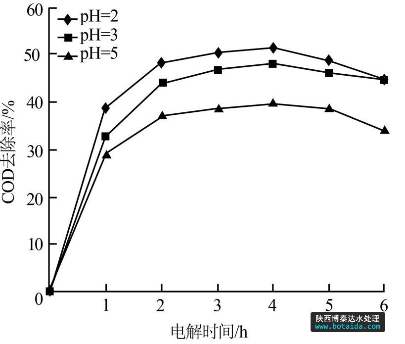 綜上不難發(fā)現(xiàn),當(dāng)滲濾液的pH分別為2、3、5 時(shí),隨電解時(shí)間的延長,COD去除率進(jìn)一步增加,但超過4 h后去除率基本不變;當(dāng)電解電壓為24、36 V,電解4 h時(shí),COD去除率達(dá)到最大;極板間距為1.5 cm時(shí),電解約4 h COD去除率也達(dá)到最大值。這說明采用Ir-Ta-Sn摻雜電極對(duì)垃圾滲濾液進(jìn)行電催化降解時(shí),電解時(shí)間不宜超過4 h,此時(shí)COD去除率已達(dá)到最大值;電解時(shí)間繼續(xù)延長,垃圾滲濾液中的COD不但不降低,反而會(huì)有一定程度的回升。因此合理控制電化學(xué)氧化時(shí)間,可以減少能耗,并提高COD去除率。