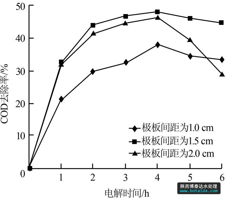(3)調(diào)節(jié)極板間距至1.5~2.0 cm對(duì)提高垃圾滲濾液的COD去除率有利。過小的極板間距會(huì)產(chǎn)生短路現(xiàn)象,過大則會(huì)降低去除效果。