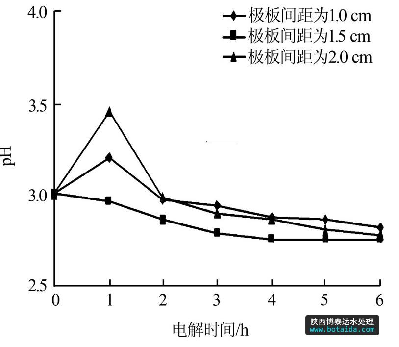 圖 6 不同極板間距下pH隨時(shí)間變化情況