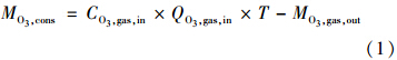 臭氧氣體濃度用碘量法測定.反應(yīng)結(jié)束后,用氮?dú)鈱⑾到y(tǒng)中殘留的臭氧吹出,并用1% KI溶液收集.實(shí)際消耗的臭氧由公式(1)計(jì)算.