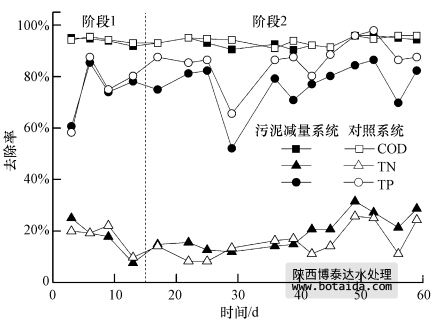 圖 5 污泥減量系統(tǒng)與對(duì)照系統(tǒng)中COD、TN和TP的去除率