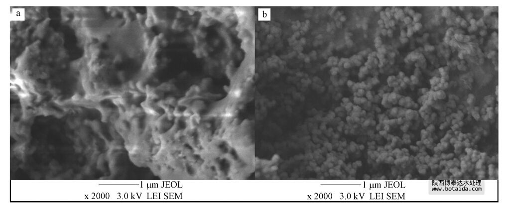 圖 1 試樣的SEM圖(a: GTE-Fe NPs; b: CTAB作用下合成的GTE-Fe NPs)