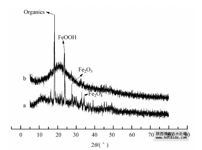圖 2 試樣的XRD圖(a.GTE-Fe NPs; b. CTAB作用下合成的GTE-Fe NPs)