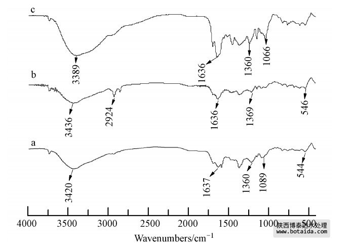圖 3 試樣的FTIR圖(a.GTE-Fe NPs;b.CTAB作用下合成的GTE-Fe NPs; c.GTE)