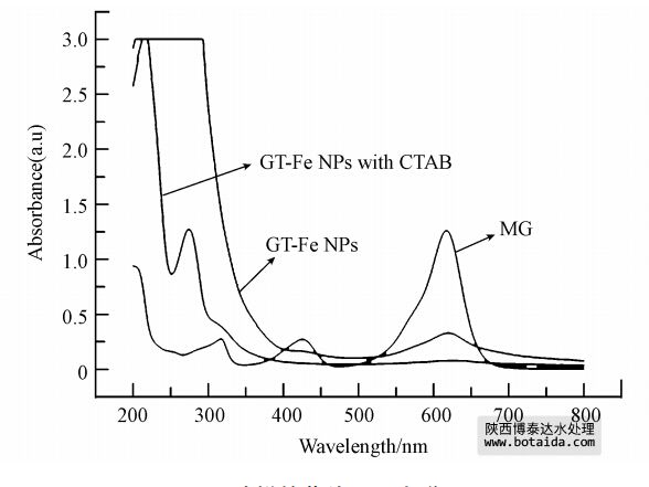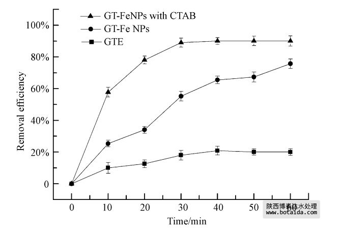 2)比較GTE、GTE合成的Fe NPs和CTAB作用下GTE合成的Fe NPs對MG的去除效果發(fā)現(xiàn),GTE對MG有一定的去除作用,30 min達(dá)到平衡時,去除率為20.03%;GTE合成的Fe NPs對MG的去除效率30 min為52.28%,反應(yīng)平衡時達(dá)到75.66%;而CTAB作用下GTE合成的Fe NPs對MG的去除效率更大,30 min就達(dá)到了77.78%,反應(yīng)達(dá)到平衡高達(dá)91.06%. Fe NPs是去除MG的主要物質(zhì).