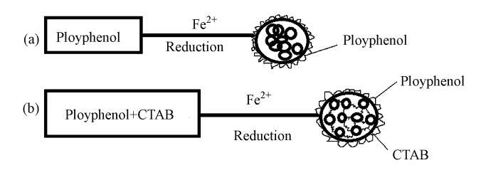 用植物提取液合成納米金屬主要是通過植物提取液中的有機(jī)成分如多酚等為還原劑還原金屬鹽,GTE中多酚可作為還原劑還原亞鐵鹽制備Fe NPs(Njagi et al., 2011; Shahwan et al., 2011; Kharissova et al., 2013; Mittal et al., 2013). GTE合成Fe NPs和CTAB作用下GTE合成Fe NPs可能的機(jī)理如圖 6所示. 陽離子表面活性劑CTAB存在時,由于CTAB吸附在納米顆粒表面導(dǎo)致納米鐵帶電荷,納米顆粒之間的斥力作用使得合成的納米顆粒更加分散,從SEM、XRD、FTIR和UV-vis等的表征結(jié)果也可證實CTAB的包覆使得合成的納米鐵更加穩(wěn)定.