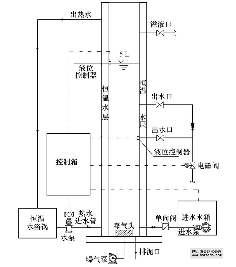 反應(yīng)器有效容積5 L,內(nèi)徑為100 mm,總高850 mm(圖 1).SBR運(yùn)行參數(shù):自控裝置控制運(yùn)行周期,處理水量為2.5 L · 周期-1,每周期6 h,包括進(jìn)水5 min,曝氣240 min,靜沉75 min,排水10 min,靜置30 min;溫度(25.0±0.5)℃.進(jìn)水水箱中設(shè)有循環(huán)泵,確保進(jìn)水成份均勻.曝氣時(shí)控制反應(yīng)器內(nèi)DO≥2 mg · L-1.實(shí)驗(yàn)過程中平均1天排1次泥,保證MLSS為5000 mg · L-1左右,污泥齡約為6 d.