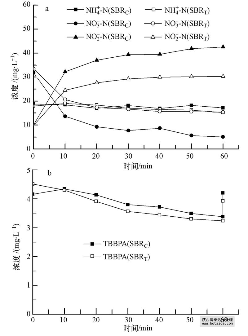 兩套SBR反應(yīng)器穩(wěn)定運行狀態(tài)下,出水乙酸鈉和亞硝酸鹽濃度低于檢測方法的檢出限,出水PO3-4-P,NH+4-N濃度均小于0.5 mg · L-1,反應(yīng)器具有良好的脫氮除磷功能;SBRC反應(yīng)器出水NO-3-N濃度為(12.9±2.2)mg · L-1,SBRT反應(yīng)器出水NO-3-N濃度為(15.3±2.0)mg · L-1.表明TBBPA對SBR反應(yīng)器硝化和除磷效率沒有太大影響,但對出水硝態(tài)氮濃度略有影響.