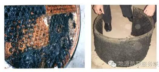 1)防堵塞。未處理原生污水中含有大尺度懸浮物,包括纖維狀的發(fā)絲類(lèi)、紙屑類(lèi)、藻狀類(lèi),普通的換熱設(shè)備是根本無(wú)法承受的。而實(shí)踐證明:已處理污水和地表水中的懸浮物含量相對(duì)較少,盡管與未處理原水不在同一數(shù)量級(jí),但隨著運(yùn)行時(shí)間增長(zhǎng),堵塞問(wèn)題也立即突現(xiàn),原水的堵塞時(shí)間為1~3d,而地表水則為7~10d。圖4是未處理原生污水的堵塞現(xiàn)象,圖5是已處理污水的堵塞狀況。