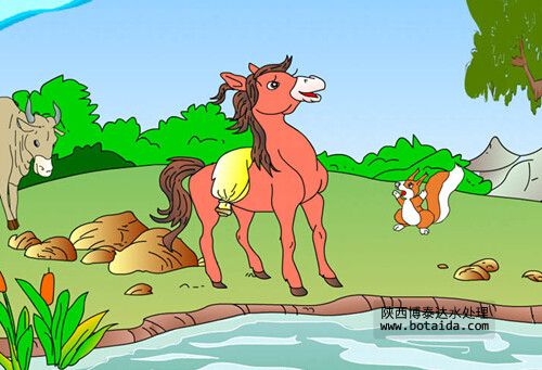 他剛一邁腿,忽然聽(tīng)見(jiàn)一個(gè)聲音說(shuō):“小馬,小馬別下去,這河可深 啦。”小馬低頭一看,原來(lái)是小松鼠。小松鼠翹著她的漂亮的尾巴,睜者圓圓的眼睛,很認(rèn)真地說(shuō):“前兩天我的一個(gè)伙伴不小心掉進(jìn)了河里,河水就把他卷走了。”小馬一聽(tīng)沒(méi)主意了。