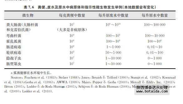 表7.6中,可以清楚地看到糞便指示菌,如大腸桿菌在廢水中常常呈現(xiàn)較高濃度。每個(gè) 人都會(huì)散布大腸桿菌,但濃度變化很大。只有被感染的人散布病原體,因此,廢水中病原體 濃度變化更大。這樣的變化取決于擴(kuò)散模式,也依賴于其他因素,如排放廢水的人群規(guī)?;?被其他廢水、如工業(yè)廢水稀釋的規(guī)模。傳統(tǒng)廢水處理在廢水被排放到地表水之前,常常降低 一到兩個(gè)數(shù)量級(jí)的微生物濃度。在其他地方,原水被直接排放,或者通過(guò)排水管溢流偶爾排 放。排放廢水被受納水體稀釋,從而減少了病原體數(shù)量,稀釋因子是因地而異。病原體失 活、死亡或進(jìn)入到沉積物里也會(huì)使病原體減少。這些因子隨著表面水體和氣候的不同而變 化。這種變化說(shuō)明糞便指示菌和病原體的濃度在地表水體比廢水中變化更多。