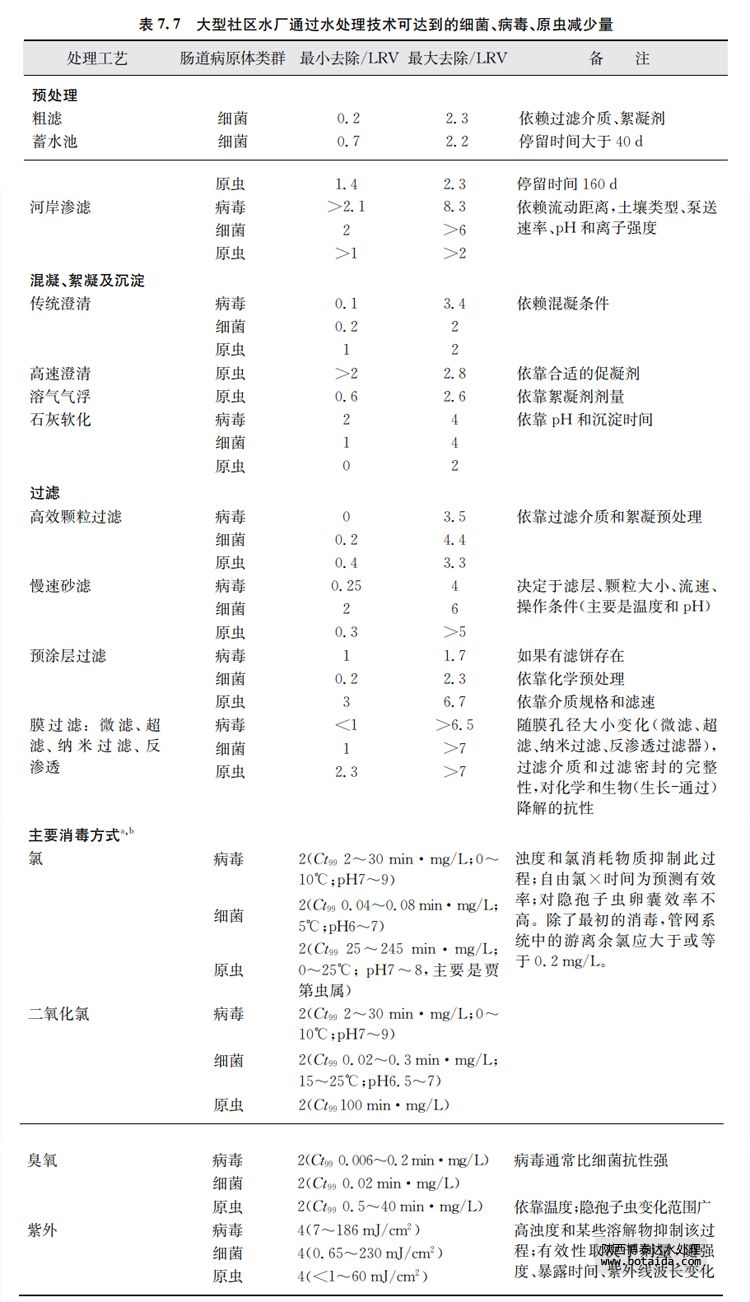 表7.7中列出的微生物降低水平是指微生物的大類(lèi)群或類(lèi)別:細(xì)菌、病毒和原蟲(chóng)。由 于各種微生物本身所固有的特性(如大小、外保護(hù)層特性和表面理化性質(zhì)等)不同,因而不同 種類(lèi)的微生物的處理效果往往存在差異。在這些微生物類(lèi)群中,處理效果在特定的種、型、 株間差別較小。但這種差別確實(shí)存在,表中針對(duì)各類(lèi)群微生物中抵抗力強(qiáng)、存活時(shí)間久的病 原體列出了去除的保守估計(jì)。若某一微生物類(lèi)群中不同的病原體在處理后下降值差別較大 時(shí),則在表中單獨(dú)列出針對(duì)相應(yīng)病原體的處理結(jié)果。