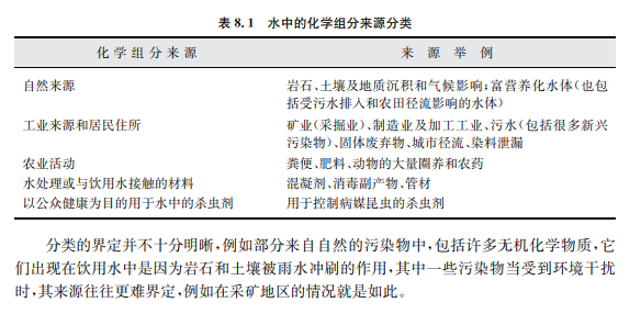 一般說來,以下兩種情況下,飲用水中化學(xué)危害的管理方法是不同的:污染物主要來自 飲用水的水源(主要通過控制污染物源頭,例如通過水源的選擇,水源污染控制、處理或混 合)以及污染物來自飲用水生產(chǎn)和輸配過程(通過優(yōu)化工藝過程或嚴(yán)格出水標(biāo)準(zhǔn)加以控制)。 因此,在本準(zhǔn)則中根據(jù)化學(xué)物質(zhì)主要來源分成5個(gè)組,見表8.1。