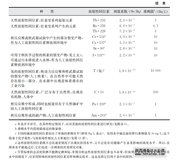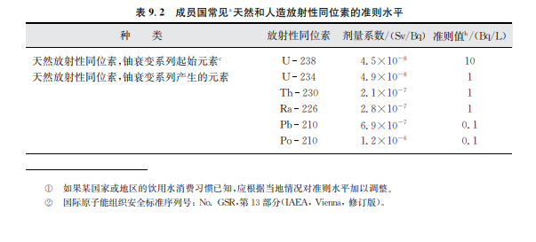 從放射學(xué)的角度,超過準(zhǔn)則值的程度也是一個需要考慮的關(guān)鍵問題。防護(hù)電離輻射和輻 射源安全的國際基本安全標(biāo)準(zhǔn)在有關(guān)現(xiàn)有暴露的章節(jié)提到了飲用水并提出由使用飲用水帶來 的個人年最高輻射劑量最大不能超過約1mSv②。這一水平不應(yīng)被當(dāng)作“可接受的”水平或限 制性水平,并應(yīng)盡可能地采取有效措施減少受到的輻射水平。每種超過準(zhǔn)則水平的情況不同, 在做出最后的決定之前還需要考慮一些非放射方面的因素(如補(bǔ)救措施的經(jīng)濟(jì)成本、其他供水 源的實用性)。政府的有關(guān)部門應(yīng)意識到,放射性同位素(如鈾)同時具有化學(xué)毒性,那么在水 中的允許濃度可能需要以其同位素的毒性確定,而不是依據(jù)放射性(見第12章)。