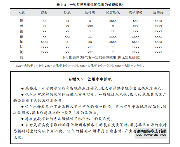 鈾、鐳以及氡都溶解于水。地表水(如江河湖泊)中含有氡,在水流過(guò)巖石和土壤過(guò)程中 易因攪動(dòng)作用釋放到大氣中。泉水和井水等地下水通常比地表水含有更高的氡,在比較極端的情況下,這類(lèi)水源作為飲用水供應(yīng)可能含有極高含量的氡(見(jiàn)專(zhuān)欄9.5)。