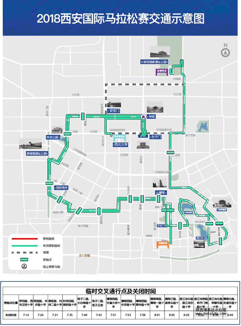 受西安國際馬拉松比賽影響,周五晚間22時開始至比賽結(jié)束,長安路(南門至南稍門段)、南門盤道、南大街(粉巷至南門盤道段)、雁塔南路(雁南四路至南三環(huán)段)、雁南五路(翠華路至楓林溪園西門段),實行交通管制;10月19日12時起,賽道全段(含機(jī)動車道、非機(jī)動車道、人行道)禁止停放各種車輛,禁止堆放各類物品。