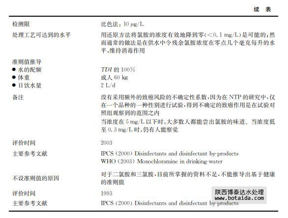 2)二氯胺和三氯胺 二氯胺和三氯胺沒有被廣泛研究,兩者現(xiàn)有的研究資料均不足以推導(dǎo)基于健康的準則 值。不過,如果氯胺的含量沒有控制得當,這些化合物會造成水的味道與氣味問題(詳見第 10章)。