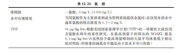 一氯胺、二氯胺和三氯胺是飲用水加氯消毒的副產(chǎn)物(見表12.24),在水中加入氯和氨 時可形成上述物質(zhì)。在飲用水管網(wǎng)系統(tǒng)中加入一氯胺可保持殘留的消毒活性。由于多氯胺 的形成不規(guī)律,而且相同濃度下一氯胺導(dǎo)致的味道和氣味問題較多氯胺嚴重,故只考慮設(shè)立 一氯胺基于健康的準則值。氯胺在胃中受胃液作用迅速分解。使用氯胺代替氯消毒可減少 在飲用水供應(yīng)中三鹵甲烷的形成。不過,有研究顯示添加氯胺會形成其他副產(chǎn)品,如鹵代 酮、三氯硝基甲烷、氯化氰、鹵乙酸、鹵代乙腈、醛類及氯酚。一氯胺是氯胺的主要成分,公認 消毒效果比自由氯差,常在二次消毒中用來保持管網(wǎng)系統(tǒng)的余氯。