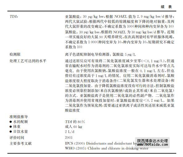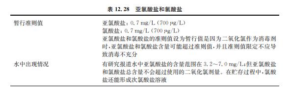 亞氯酸鹽和氯酸鹽是使用二氧化氯作為消毒劑或用于去除水中嗅味和異味的副產(chǎn)物 (見(jiàn)表12.28)。二氧化氯同時(shí)也用作纖維、紙漿、面粉和油類(lèi)的漂白劑。亞氯酸鈉和氯酸鈉 用于制備二氧化氯以及其他商業(yè)用途。飲用水出水中,二氧化氯迅速分解成亞氯酸鹽、氯酸 鹽和氯化物離子,其中亞氯酸鹽是主要成分,該反應(yīng)在堿性條件下容易進(jìn)行。飲用水是接觸 環(huán)境中二氧化氯、亞氯酸鈉和氯酸鈉的主要途徑。氯酸鹽也會(huì)在儲(chǔ)存很久的次氯酸鈉溶液 中生成,特別是在高溫環(huán)境下。