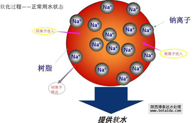 當樹脂上的大量功能基團與鈣鎂離子結合后,樹脂的軟化能力下降,可以用氯化鈉(鹽)溶液流過樹脂,此時溶液中的鈉離子含量高,功能基團會釋放出鈣鎂離子而與鈉離子結合,這樣樹脂就恢復了交換能力,這個過程叫作“再生”。