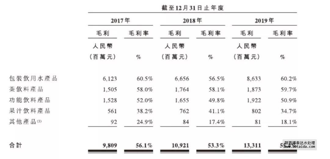 農(nóng)夫山泉的招股書(shū)顯示,公司的大類產(chǎn)品毛利率可謂是出奇的高,尤其是包裝飲用水產(chǎn)品,更是高達(dá)60.2%。此外,茶飲料和功能飲料的毛利率也超過(guò)50%,分別為59.7%和50.9%。